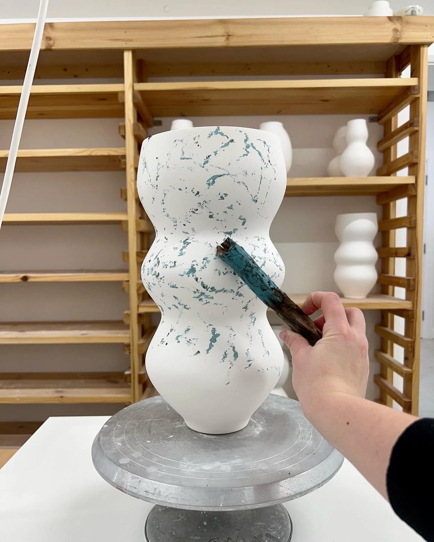 Using porcelain vessels as a blank canvas to explore nature. Creating an open door between her studio and the outdoors, the pieces encapsulate the environment in different ways. Playing with mark making and the use of natural materials to create pieces that have a balance between freedom and structure.